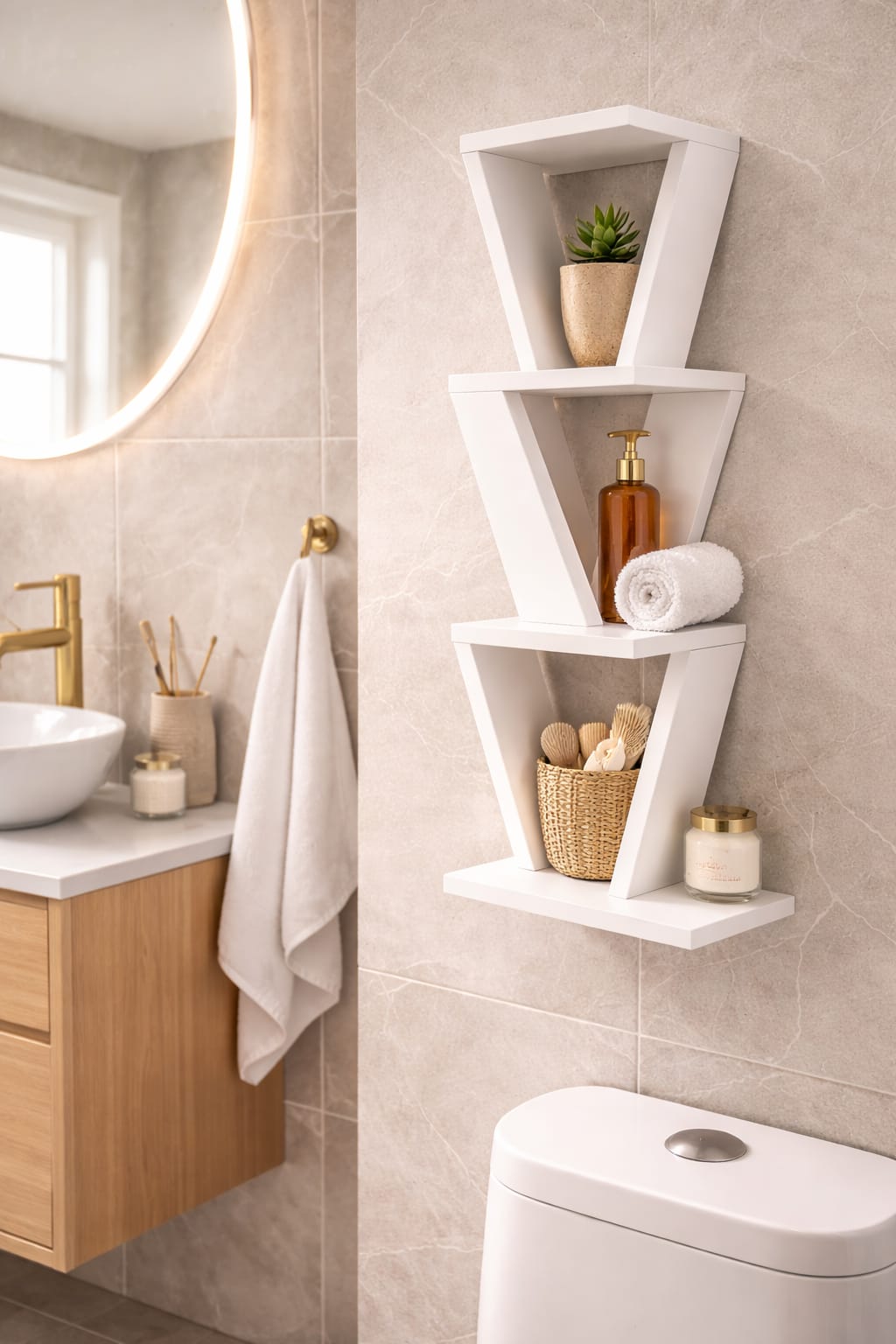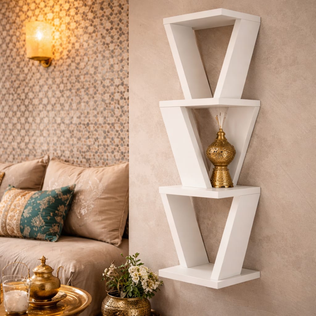 رف زاوية عصري من MDF عالي الجودة، متين وأنيق، مثالي لتزيين الصالون أو تنظيم الحمام بطريقة مرتبة وجمالية.