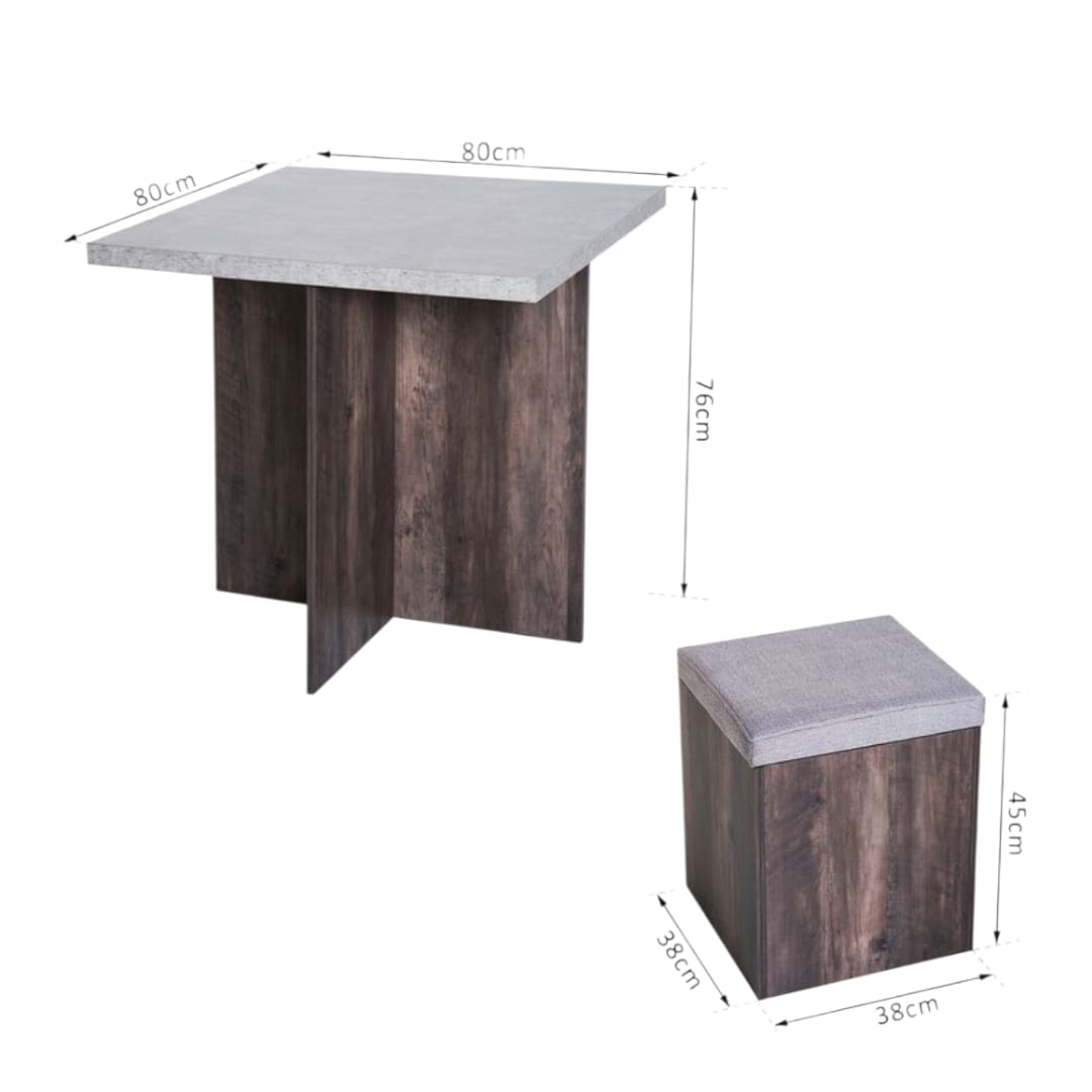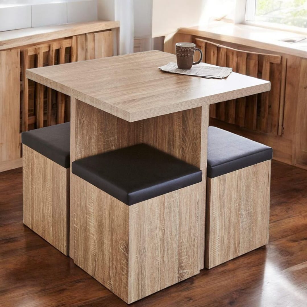 استمتع بالأناقة والعملية في تصميم واحد. طاولة مربعة بتصميم عصري مصنوعة من خشب عالي الجودة، مرفوقة بأربعة مقاعد مريحة يمكن إدخالها بالكامل أسفل الطاولة لتوفير المساحة.